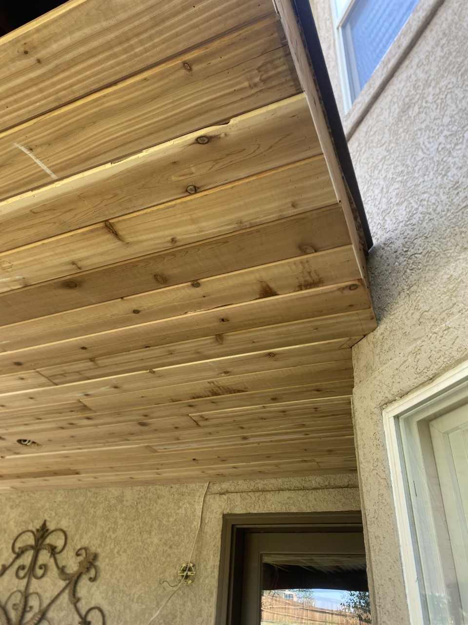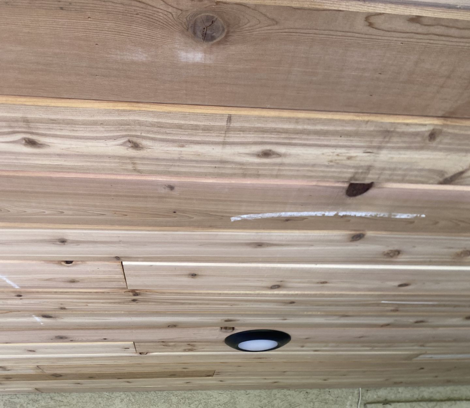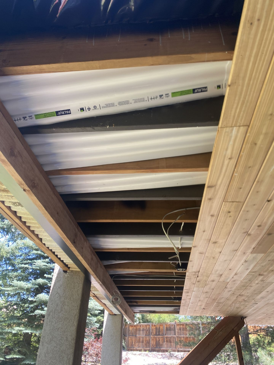 Project: Install a wood plank ceiling and lighting under the client's top deck.